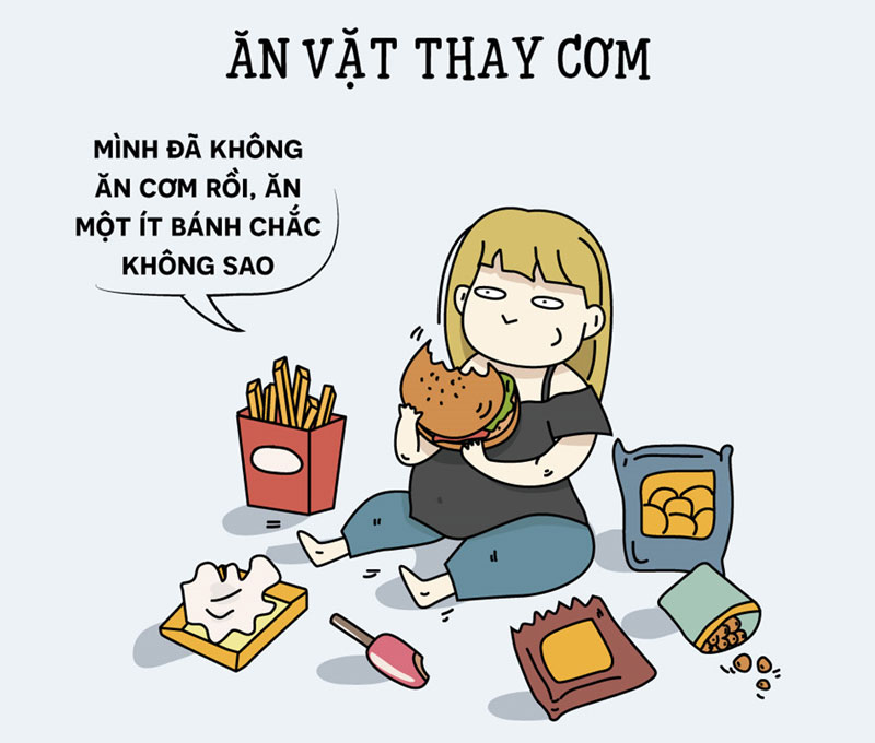 Nhiều người lo ngại trong cơm có quá nhiều tinh bột sẽ khiến bạn dễ béo hơn. Do đó, họ thường áp dụng phương pháp ăn vặt thường xuyên thay cho bữa chính. Tuy nhiên, những chất béo có hại trong thức ăn vặt có thể khiến bạn "phát tướng" hơn và nguy hiểm hơn cho cơ thể.