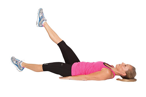 Nhịp 2: Từ từ nâng 2 chân lên sao cho vuông góc với cơ thể và giữ trong khoảng 5 giây. Sau đó, hạ chân xuống mặt sàn.