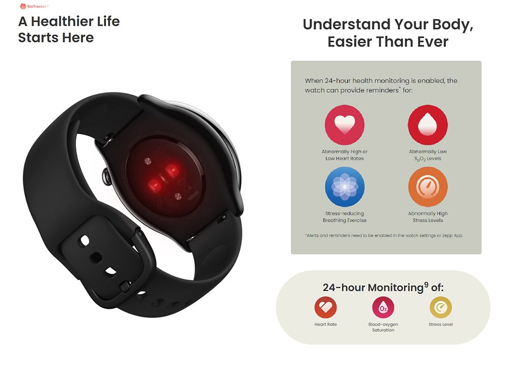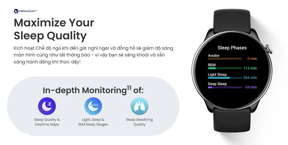 | THEO DÕI SỨC KHỎE | Đo nhịp tim 24/7 Độ bão hòa oxy máu Mức độ căng thẳng Theo dõi giấc ngủ bao gồm: - Các giai đoạn của giấc ngủ (bao gồm cả REM) - giấc ngủ ngắn ban ngày - Chất lượng hơi thở khi ngủ - Điểm giấc ngủ |