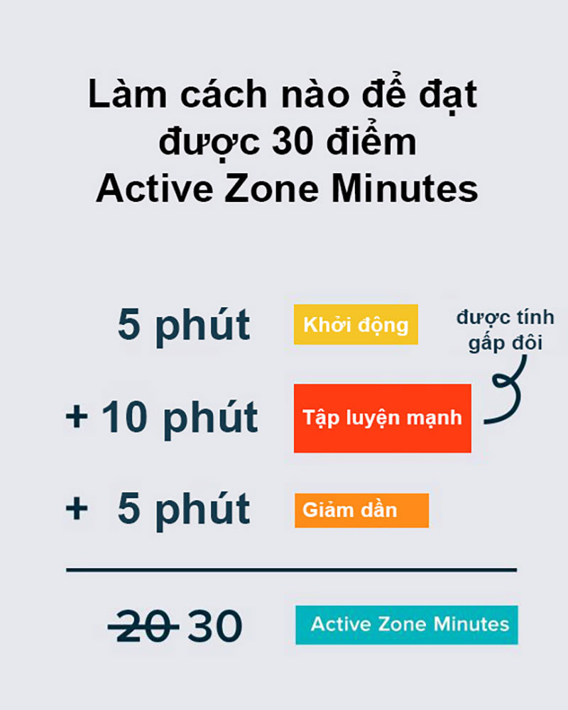 Ví dụ: Khi bạn dành 20 phút tập luyện bạn sẽ có được 30 điểm của Active Zones Minutes. Thấy có vẻ sai nhưng thực sự là đúng vì trong giai đoạn giữa bạn đã hoạt động với cường độ cao hơn nên được ghi nhận điểm gấp đôi. Hãy yên tâm rằng thiết bị của Fitbit đã tính toán thay bạn cả rồi nhé.