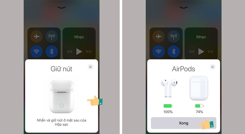 Tiếp đến, thiết bị thông báo bạn cần ấn giữ nút trên mặt lưng của hộp AirPods để kết nối (lưu ý nắp hộp phải luôn mở) > Lúc này thiết bị sẽ tự động tiến hành ghép nối. Khi hoàn thành, bạn chỉ cần nhấn chọn “Xong” là được.