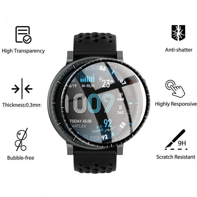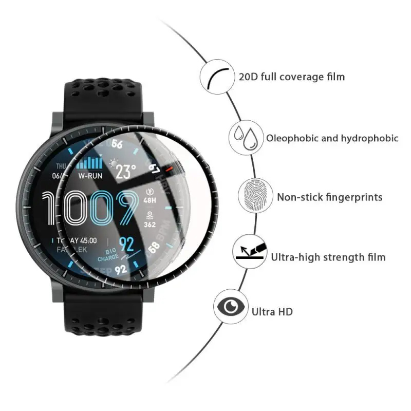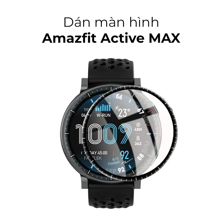 Miếng dán màn hình Amazfit Active MAX full viền giúp bảo vệ toàn diện màn hình, hạn chế trầy xước do va chạm hằng ngày.