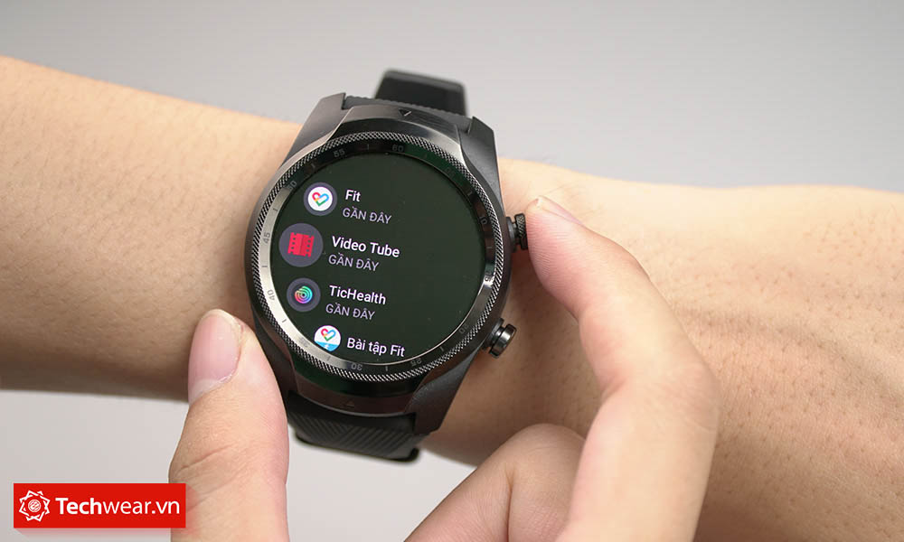 Hai nút kim loại ở bên phải của đồng hồ rất chắc chắn và có chút họa tiết nhỏ. Nút thứ nhất ở bên trên sẽ đóng vai trò như là nút Home cũng như để mở danh sách ứng dụng, hoặc kích hoạt trợ lý ảo Google Assistant khi bấm giữ. Còn nút thứ 2 bên dưới mặc định là sẽ kích hoạt ứng dụng Mobvoi, tuy vậy bạn có thể tùy biến lại nút này và cài đặt cho nó mở bất kỳ ứng dụng hay tính năng nào có mặt trên đồng hồ.