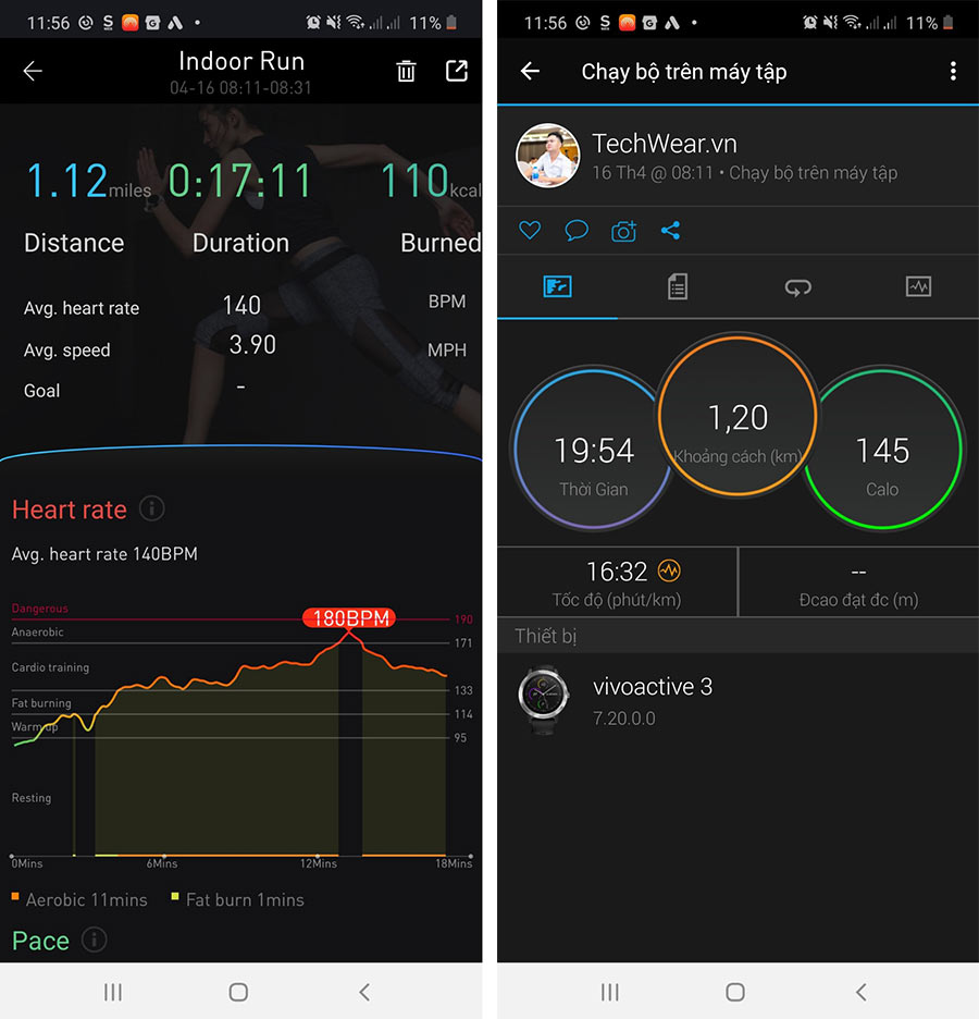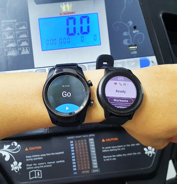 Cảm biến trên đồng hồ ghi nhận dữ liệu khá chính xác. TechWear.vn có trải nghiệm Ticwatch Pro 4G/LTE khi chạy bộ trên máy và dùng chung với Garmin Vivoactive 3. Số liệu thống kê là tương đồng nhau sau khoảng 20 phút chạy. Như hình bên dưới, trong lúc chạy trên máy, do mình có dừng lại thử khoảng 1 phút, thì tính năng Ticmotion AI kích hoạt và tạm ngưng theo dõi bài tập, do đó trong khoảng 20 phút thì trên Ticwatch chỉ ghi nhận thời gian tập luyện là 17 phút mà thôi. Đây có thể đánh giá là một điểm cộng khác biệt trong việc theo dõi thể thao.