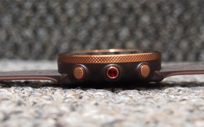 Không chỉ vậy, ở M2 bạn nhận được một khung bezel được gia cố bằng thép không gỉ và có kết cấu nổi bật nằm xung quanh màn hình, kèm theo năm nút bấm vật lý trên vỏ đồng hồ.