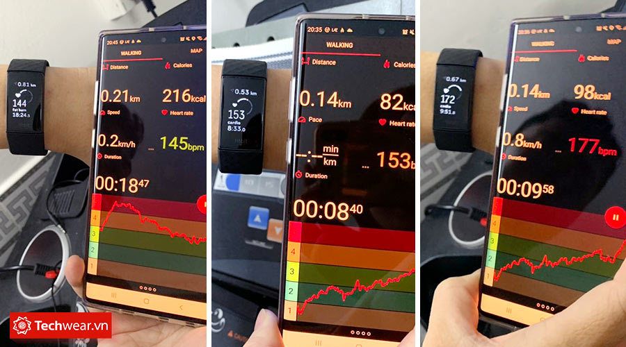 Chúng tôi đã sử dụng Fitbit Charge 4 để theo dõi buổi chạy thử trên máy chạy bộ, trong khoảng 20 phút, với vận tốc trung bình từ 3 đến 6km/h. Để đánh giá về cảm biến theo dõi khoảng cách của đồng hồ, trong quá trình chạy, tôi thử thường xuyên thay đổi trạng thái vung tay, cũng như tốc độ chạy. Thật tuyệt vời khi báo cáo khoảng cách đo trên thiết bị Fitbit Charge 4 với máy chạy bộ chỉ sai lệch chừng vài chục mét mà thôi.