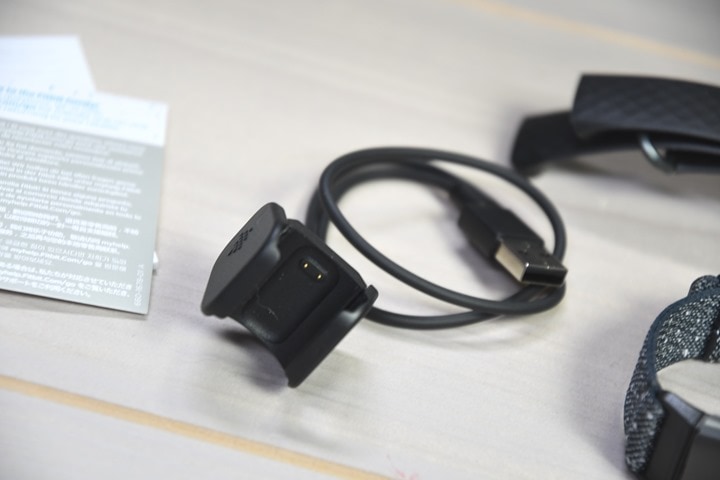 Sạc của Fitbit Charge 4 sử dụng 1 đầu USB và 1 đầu kẹp.