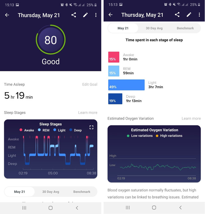Vì tính năng này chúng tôi không có thiết bị nào để so sánh, nhưng bằng kinh nghiệm sử dụng thực tế các sản phẩm Fitbit trước đây, cũng như trải nghiệm Charge 4, thiết bị này sẽ mang đến cho bạn nhiều góc nhìn hơn về giấc ngủ của mình. Bạn có thể thấy thời gian bạn dành cho giấc ngủ nông, sâu, và REM sau mỗi đêm.