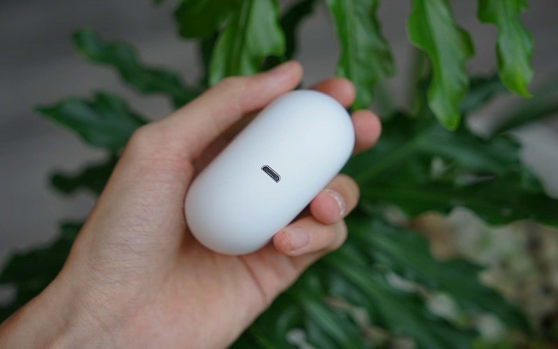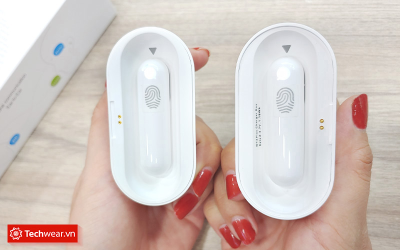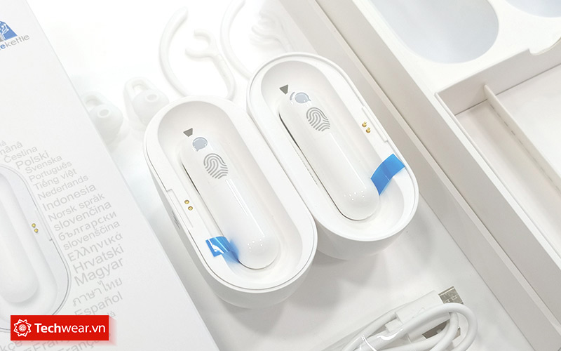 Tách đôi chiếc “bánh bao” ra làm đôi, bên trong sẽ chứa 2 tai nghe bluetooth không dây cũng được làm bằng chất liệu nhựa bóng tông màu trắng với kiểu dáng thon gọn và hơi dài. Mặt trên của mỗi bên tai nghe sẽ có thêm khu vực cảm ứng được minh họa bằng biểu tượng dấu vân tay, phía trên là vị trí đèn LED thông báo tình trạng pin và kết nối cũng như phân biệt đâu là tai nghe chính (không có dấu ngoặc phía trên biểu tượng) và tai nghe cho người cần trò chuyện (có dấu ngoặc phía trên biểu tượng).