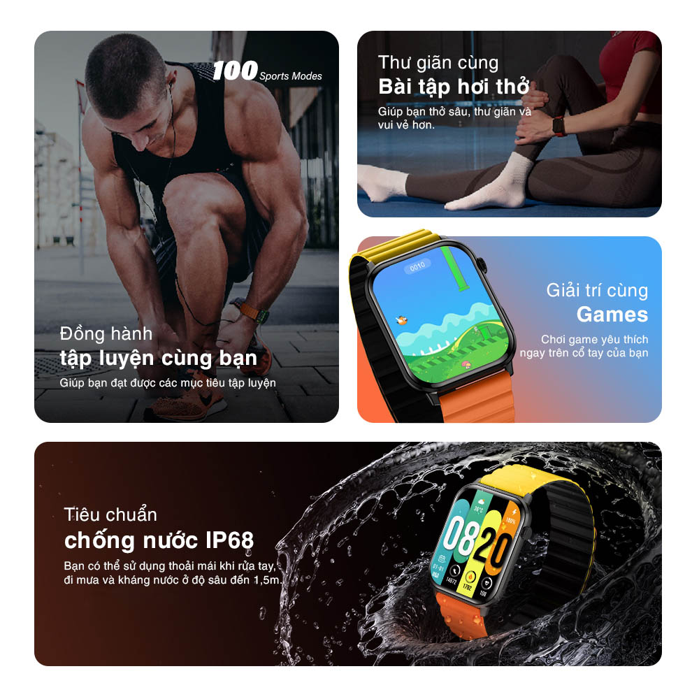 1- Trợ lý hoàn hảo: Tích hợp tính năng nghe gọi ngay có thể lưu đến 100 danh bạ trên đồng hồ, gọi trợ lý ảo tức thời với nút ấn nhanh, thời lượng pin lên đến 10 ngày, đi kèm tính năng AOD, tiêu chuẩn chống nước IP68.