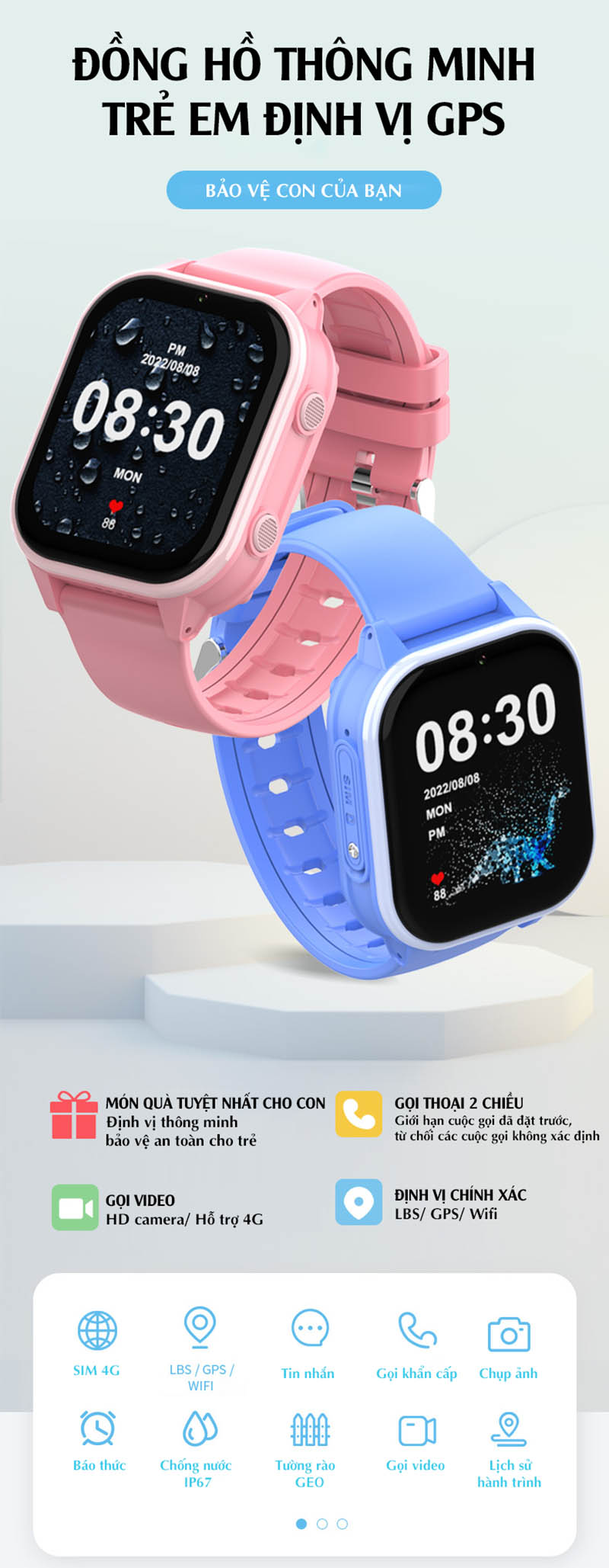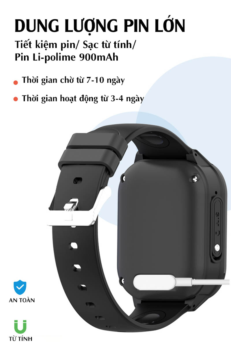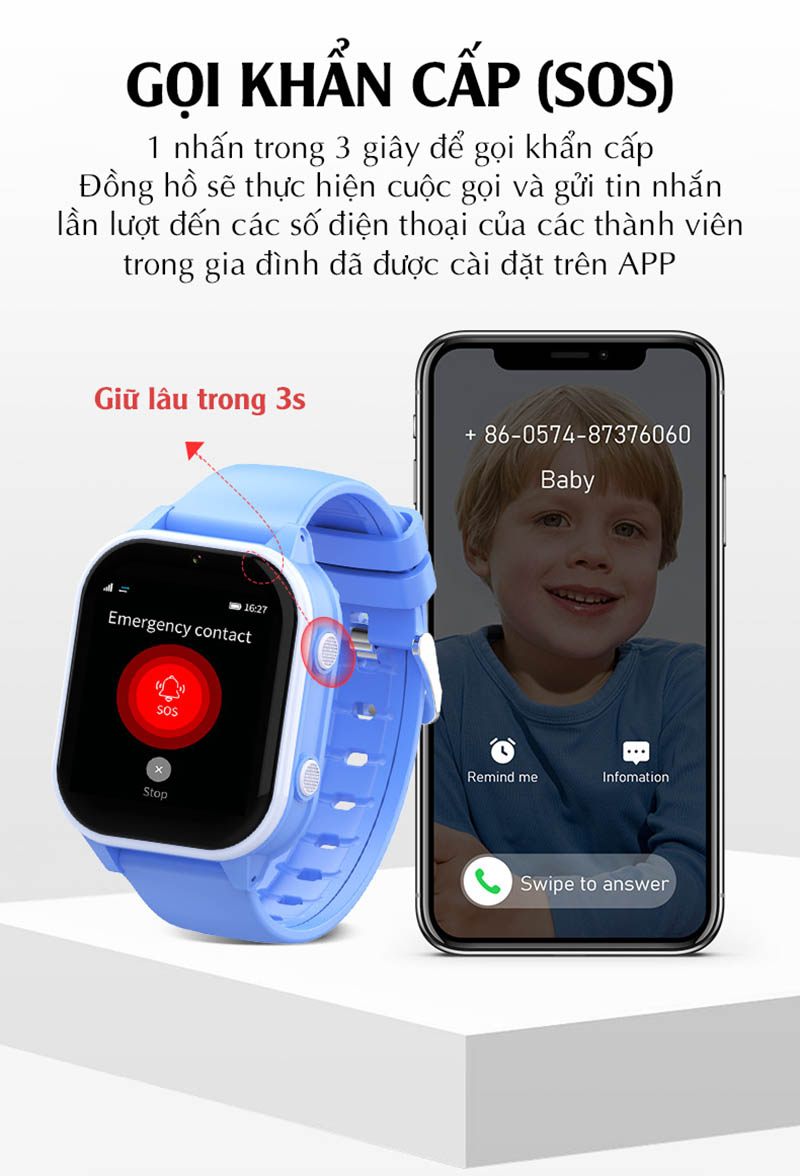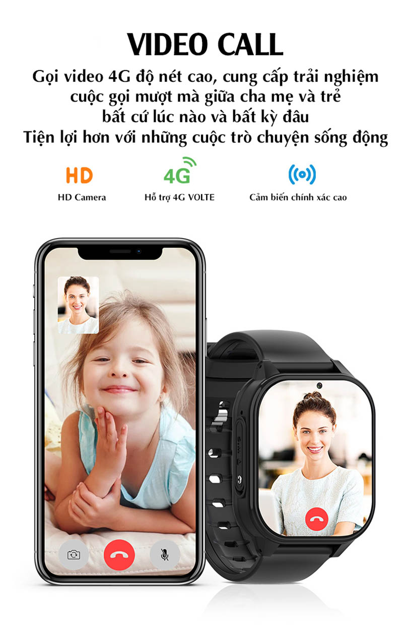 | TIỆN ÍCH THÔNG MINH | - Nghe gọi đàm thoại qua SIM - Video Call - Kiểm tra vị trí từ điện thoại Phụ Huynh (Tần suất 10 phút - 1H mỗi lần) - Báo thức - Gọi SOS khẩn cấp - Chụp ảnh - Gửi tin nhắn nhanh |