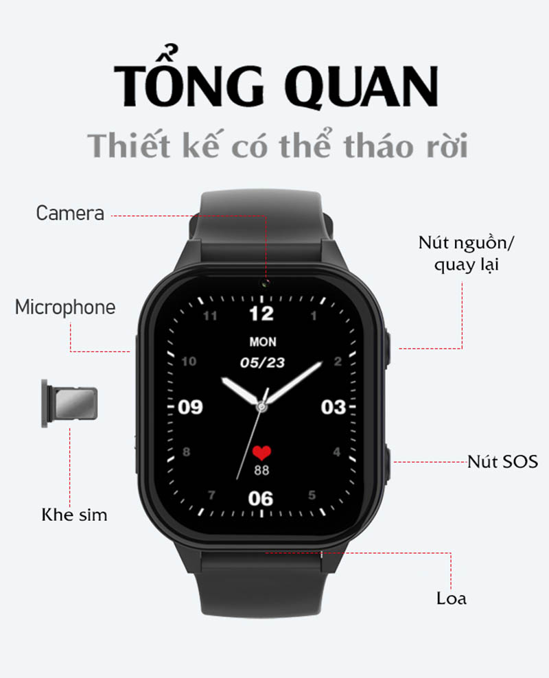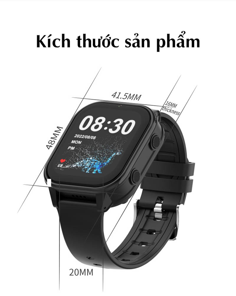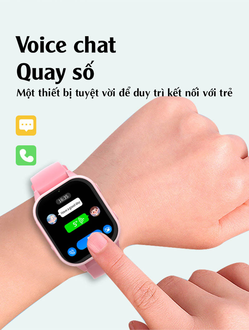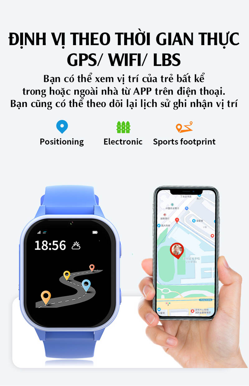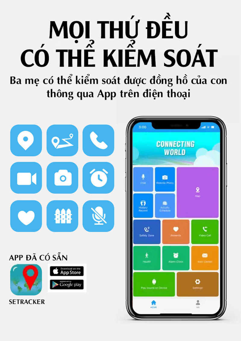 | TIỆN ÍCH THÔNG MINH | - Nghe gọi đàm thoại qua SIM - Video Call - Kiểm tra vị trí từ điện thoại Phụ Huynh (Tần suất 10 phút - 1H mỗi lần) - Báo thức - Gọi SOS khẩn cấp - Chụp ảnh - Gửi tin nhắn nhanh |