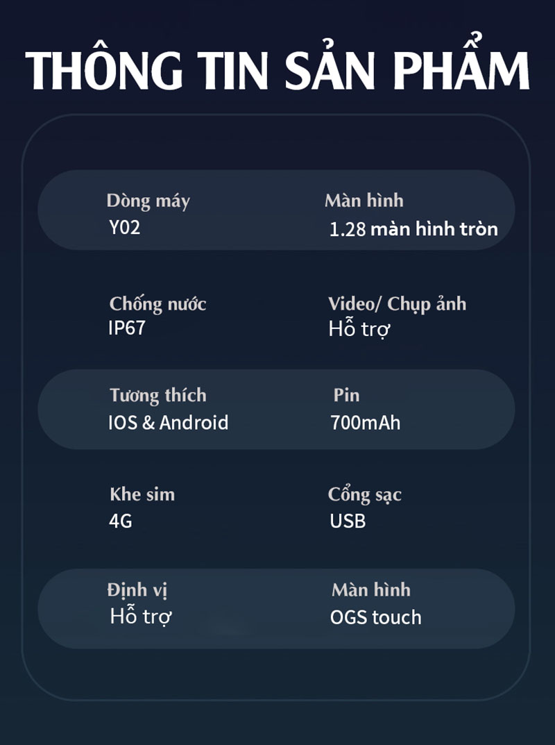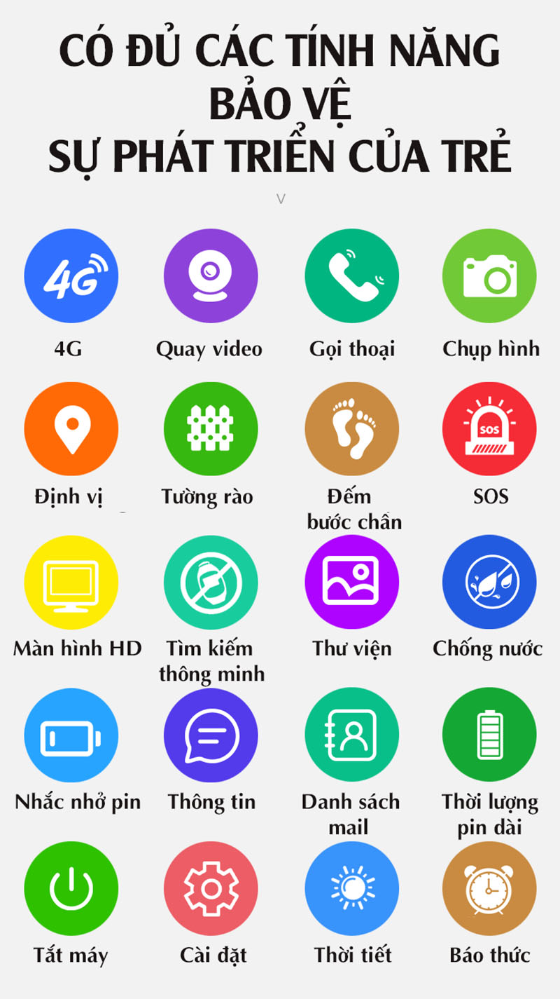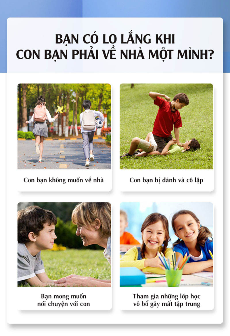 | TIỆN ÍCH THÔNG MINH | - Nghe gọi đàm thoại qua SIM - Video Call - Kiểm tra vị trí từ điện thoại Phụ Huynh (Tần suất 10 phút - 1H mỗi lần) - Báo thức - Gọi SOS khẩn cấp - Chụp ảnh - Gửi tin nhắn nhanh |