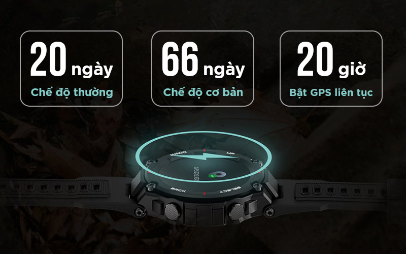 Chế độ smartwatch: 20 ngày Chế độ tiết kiệm pin: 66 ngày Chế độ GPS: 20 giờ |