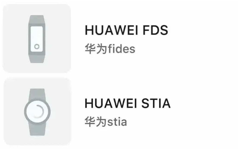 Hai thiết bị bí ẩn đã xuất hiện trong ứng dụng Huawei Health. Một người dùng trên Weibo tình cờ phát hiện trong phần thêm thiết bị của phần mềm. Vòng theo dõi (Band Fitness) được xuất hiện với tên Huawei FDS và smartwatch là Huawei STIA. Với 2 tên này, chúng tôi không biết chắc đây là tên hay chỉ là mã sản phẩm, vì đây là cái tên lần đầu tiên được nhắc đến. Có nhiều khả năng đây là những mã sản phẩm chứ chưa phải là tên chính thức của bộ đôi này.