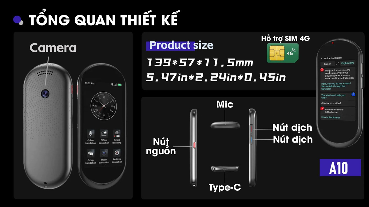 | Bộ sản phẩm | -Máy phiên dịch A10 x1 -Dây sạc x1 -Sách hướng dẫn x1 -Túi đựng x1 |