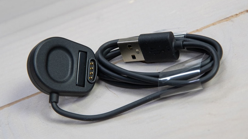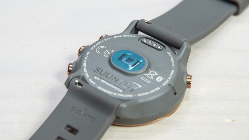 Đằng sau đồng hồ là cảm biến nhịp tim quang học, được bao phủ bởi một miếng màng bảo vệ nhỏ. Trước khi sử dụng bạn nên nhớ gỡ miếng bảo vệ đó ra để cảm biến nhịp tim được hoạt động một cách chính xác nhất. Bên trên là 4 chấu tiếp xúc để sạc năng lượng cho đồng hồ.