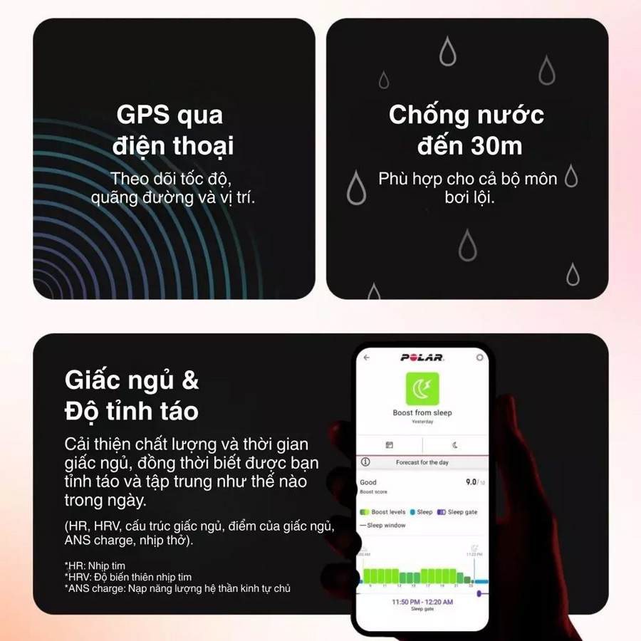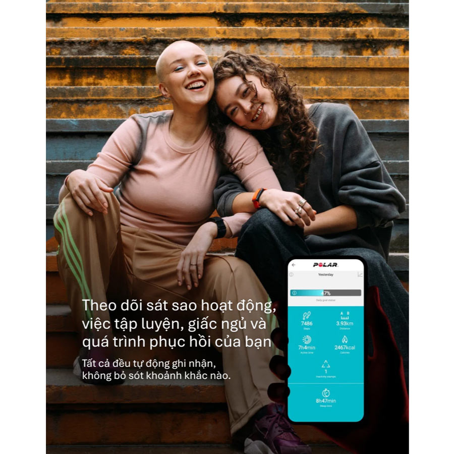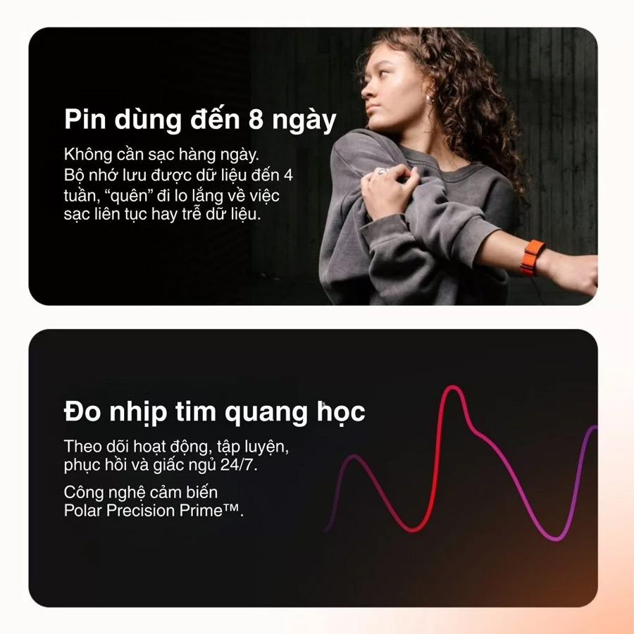 Polar tích hợp công nghệ Precision Prime, cảm biến nhịp tim quang học chính xác cao, hoạt động cả ngày lẫn đêm.