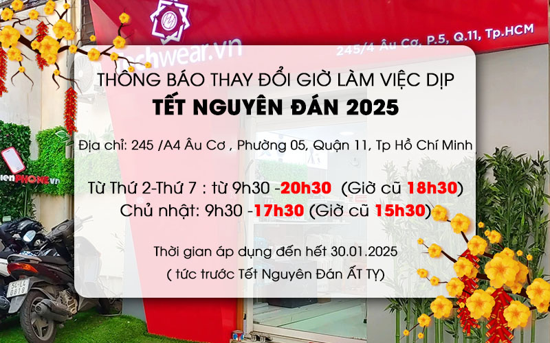 Nhằm phục vụ nhu cầu mua sắm và hỗ trợ khách hàng dịp trước Tết Nguyên Đán (2025), cửa hàng Techwear.vn xin thông báo thay đổi giờ làm việc: