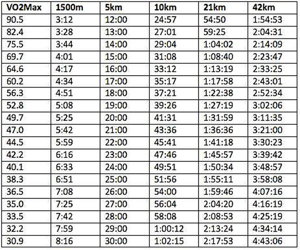 Hãy so sánh thành tích của mình trong bảng dưới đây để tính VO2 Max