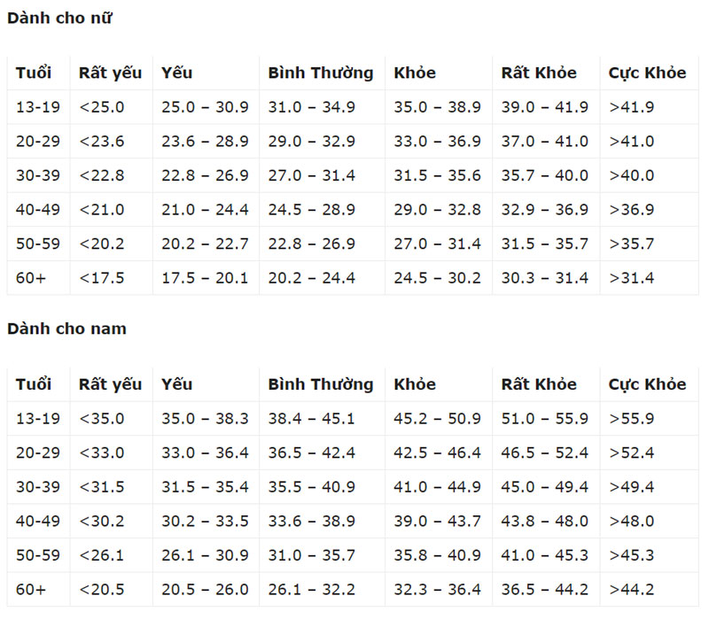 Để rõ ràng hơn, chúng ta có thể so sánh chỉ số VO2 Max giữa nam và nữ trong bảng dưới đây.