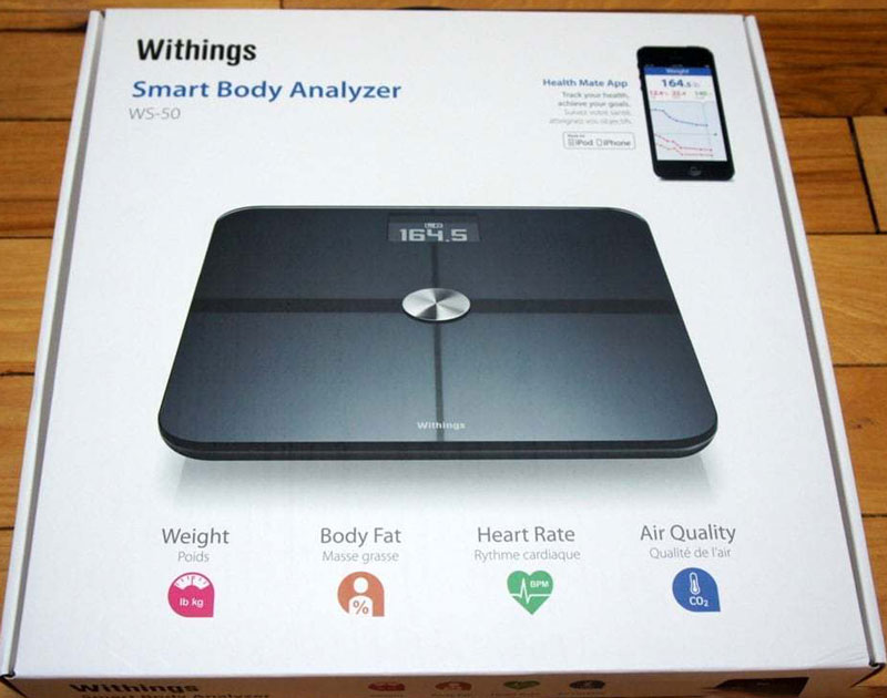 Withings Smart Body Analyzer (WS-50) là một chiếc cân không chỉ theo dõi cân nặng của bạn mà còn giúp người dùng đạt được những mục tiêu tập luyện của họ. Được kết hợp với ứng dụng Health Mate trên điện thoại bạn có thể theo dõi những chỉ số như: dữ liệu cân nặng, thành phần cơ thể (khối lượng nạc, mỡ, BMI), tỷ lệ mỡ và nước,... Không chỉ có vậy, nó còn có thể theo dõi nhịp tim và chất lượng không khí.