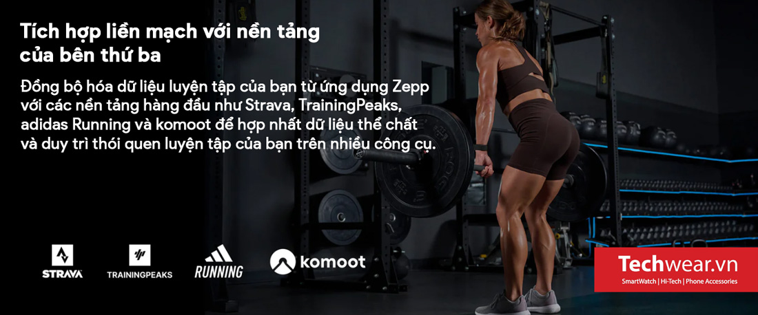 Đồng bộ với Strava, TrainingPeaks, Komoot thông qua ứng dụng Zepp & nền tảng Terra.
