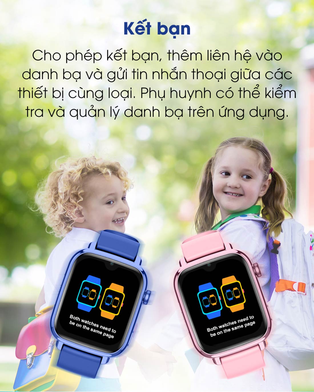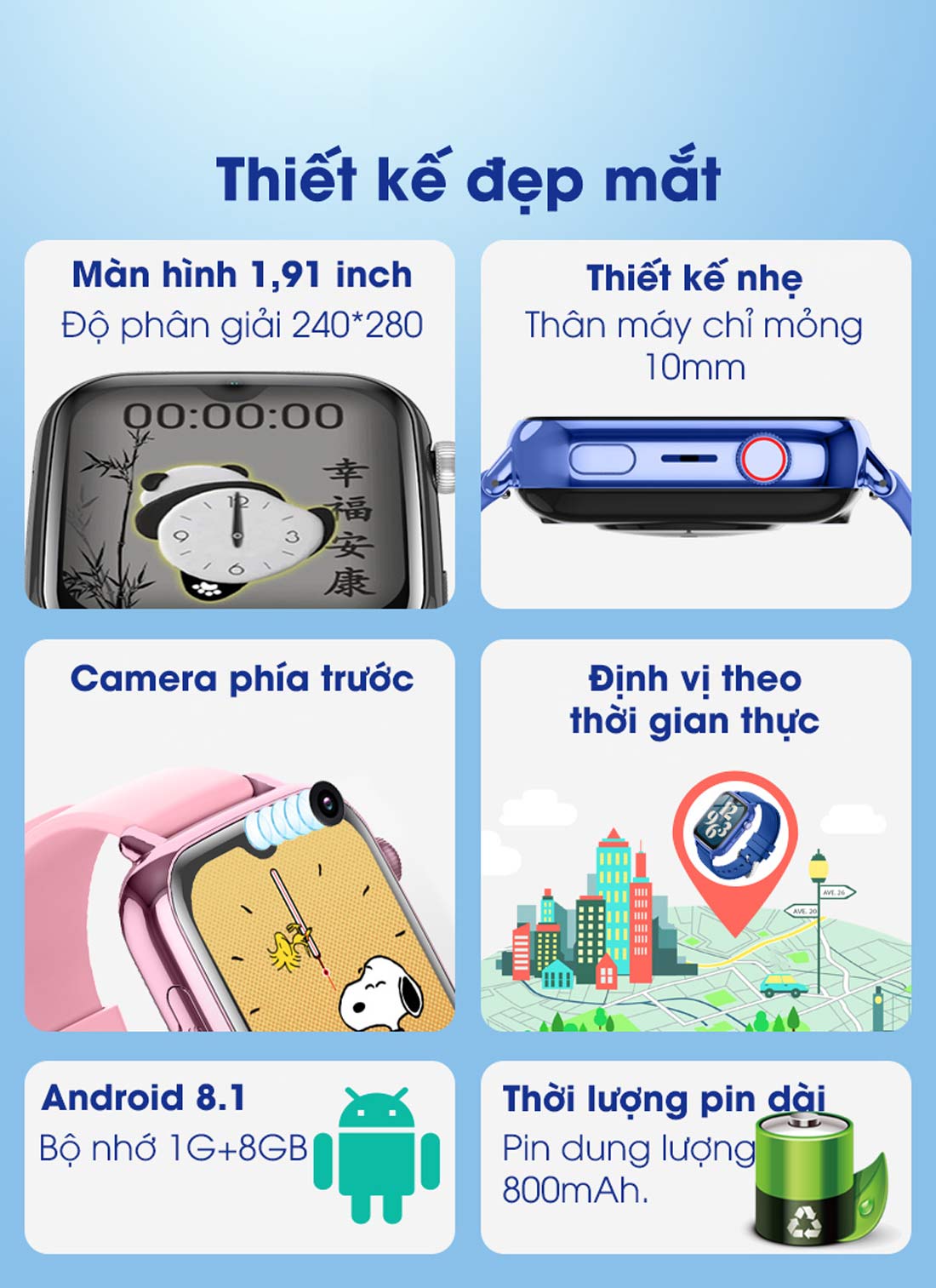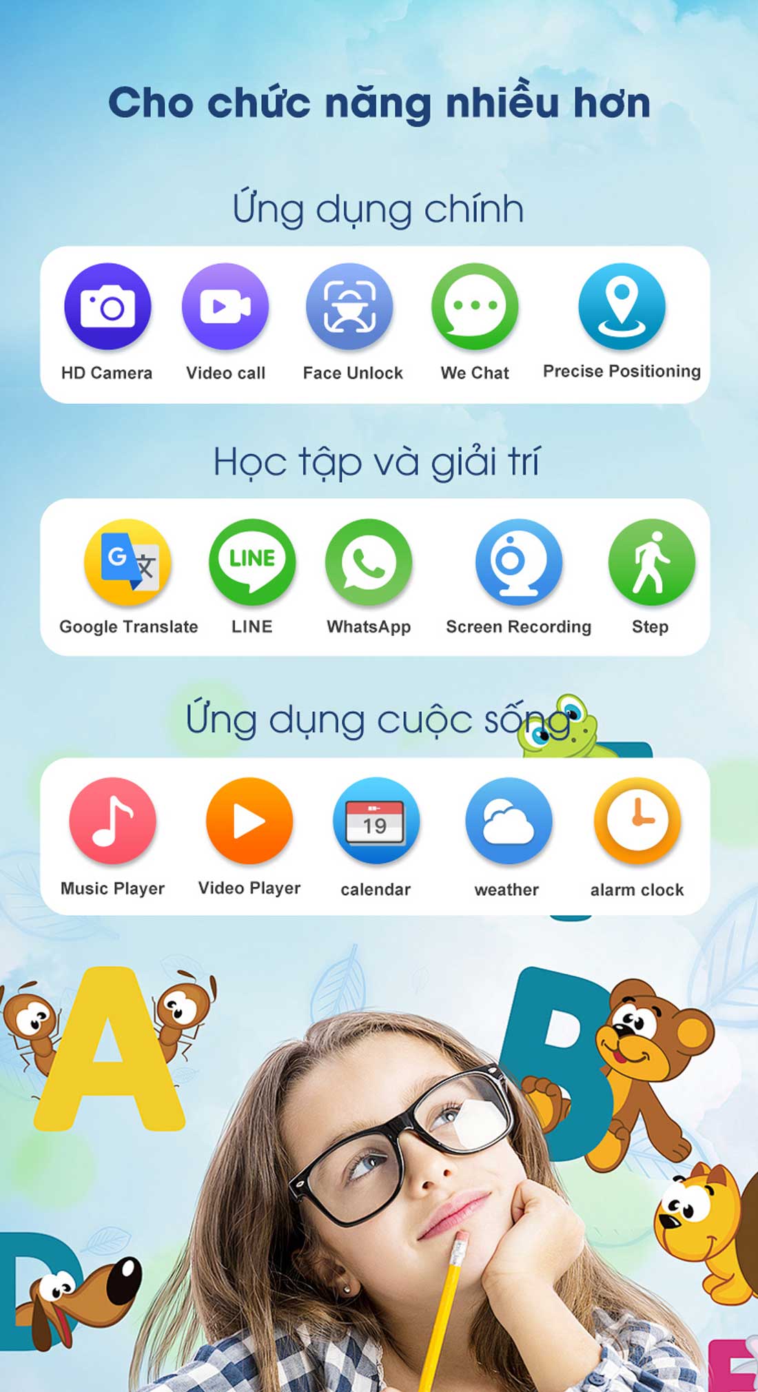 | TIỆN ÍCH THÔNG MINH | - Nghe gọi đàm thoại qua SIM - Chặn cuộc gọi số LẠ - Thiết lập không sử dụng theo giờ học - Video Call - Kiểm tra vị trí từ điện thoại Phụ Huynh (Tần suất 10 phút - 1H mỗi lần) - Báo thức - Gọi SOS khẩn cấp - Chụp ảnh - Gửi tin nhắn nhanh |
