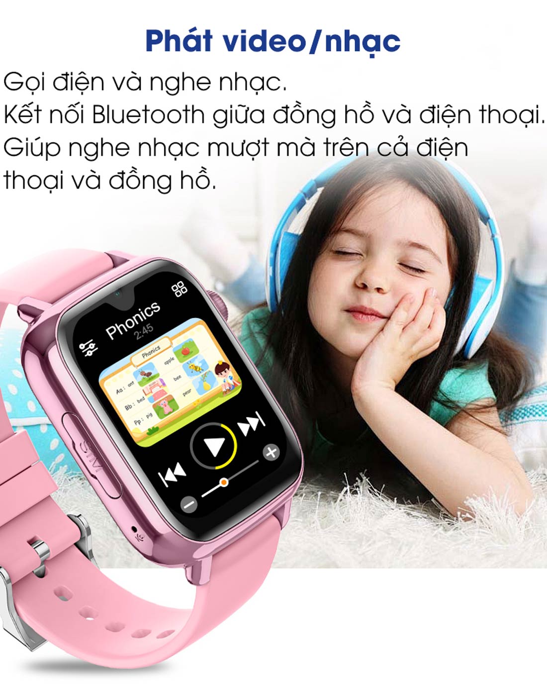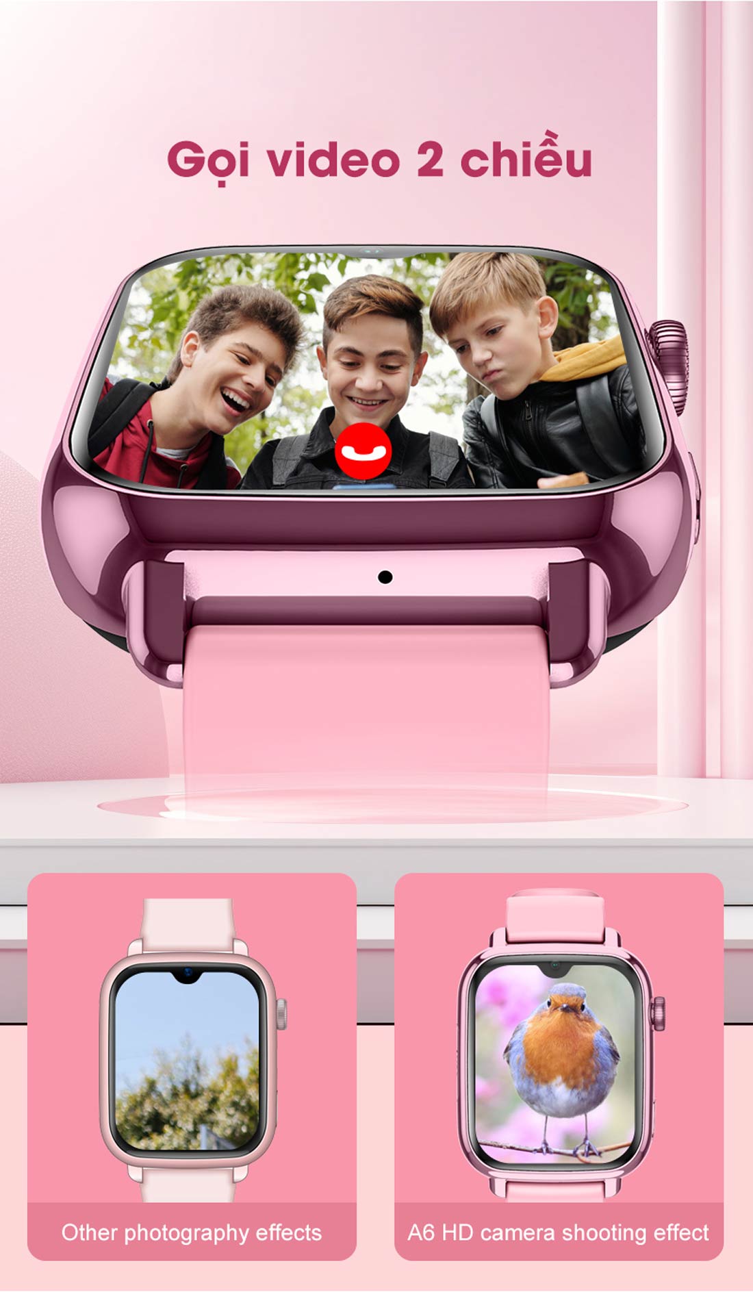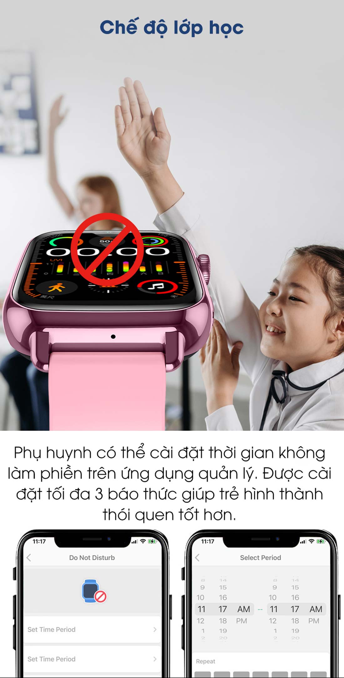 | TIỆN ÍCH THÔNG MINH | - Nghe gọi đàm thoại qua SIM - Chặn cuộc gọi số LẠ - Thiết lập không sử dụng theo giờ học - Video Call - Kiểm tra vị trí từ điện thoại Phụ Huynh (Tần suất 10 phút - 1H mỗi lần) - Báo thức - Gọi SOS khẩn cấp - Chụp ảnh - Gửi tin nhắn nhanh |